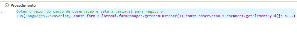 Estou encontrando um problema ao utilizar javascript pra encontrar o valor de um campo e setar o valor de uma variavel do latromi. O código executa porém o valor da variável não está atribuído para a próxima execução dentro do procedimento.