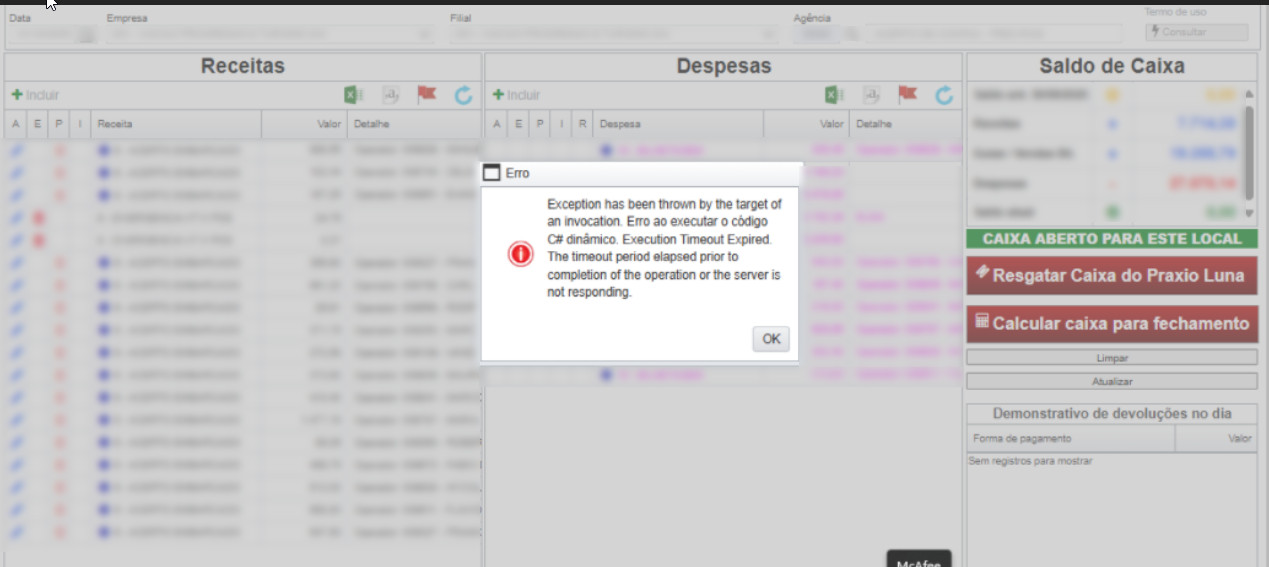 Esta dando TimeOut no fechamento do caixa