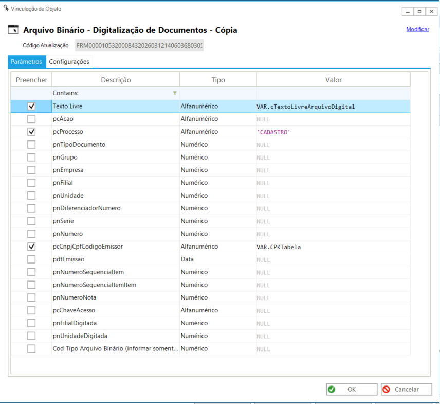 Os parâmetros utilizados no formulário são esses: