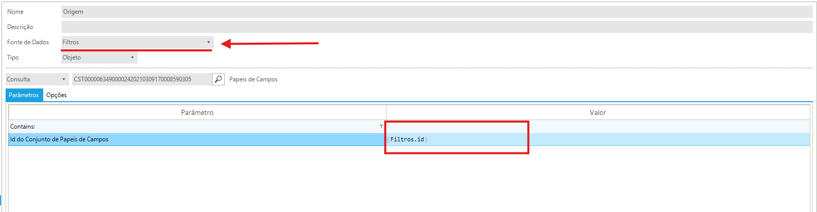 - Na origem selecione a fonte de dados criada. E adicione as colunas que serão usadas para filtragem.
