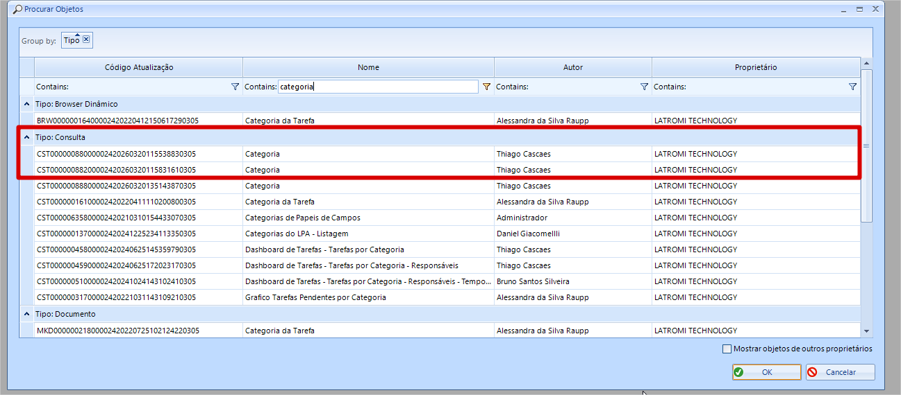 Segue print com dois objetos em destaque que estão excluídos no Latromi.