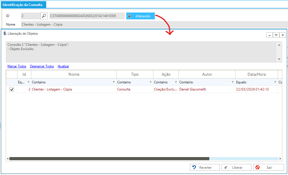 Antes disso, é possível localizar o Objeto para usar os atalhos de liberação, onde é possível efetivar (liberando) ou reverter a exclusão.