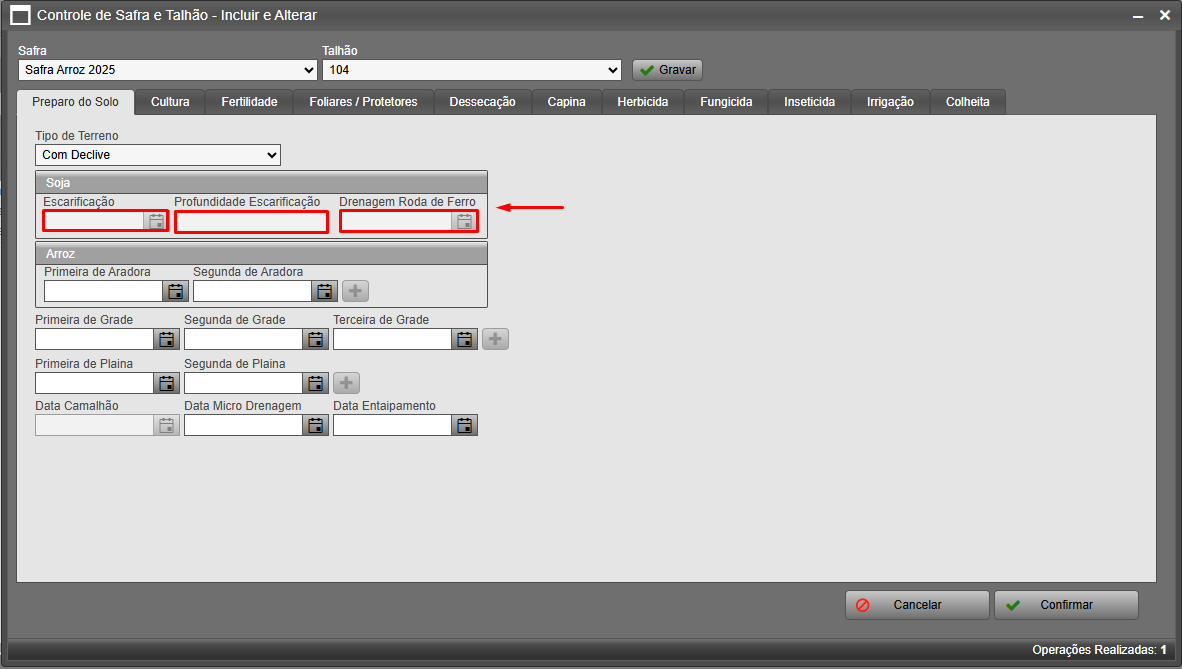 Na janela acima os campos em vermelho são habilitados apenas quando a cultura selecionada é igual a “Soja”. Acho que ficaria mais interessante esse painel mostrando apenas os campos referente à cultura. (até por que nessa aba em específico tem “poucos” campos, na aba de Fertilidade por exemplo ficam vários campos habilitados e desabilitados, gerando uma desorganização pro usuário)