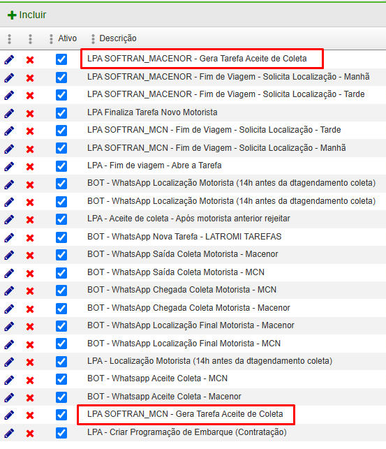 Hoje, conseguimos organizar os LPA’s por categorias, mas seria interessante conseguirmos ordenar linha a linha os LPA’s cadastrados. Por exemplo, senti essa necessidade quando criei um LPA que espera um parâmetro específico. Nesse cenário, foi necessário cadastrar esse LPA 2 vezes no agendador, para carregar parâmetros diferentes. Porém, como a data de criação dos 2 LPA’s ficou bem diferente, a organização da lista de LPA ficou prejudicada. Na imagem abaixo, mostra a lista de LPA’s do cliente. Os LPA’s em destaque se referem a mesma rotina, com a passagem de parâmetros diferentes no agendador.