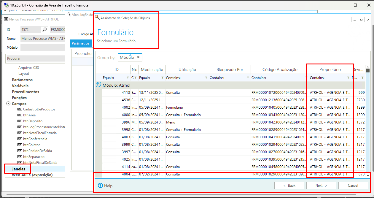 Após a atualização da versão 3.5.367 não localizamos a opção para listar objetos de outros proprietários para seleção de objetos na Janela: